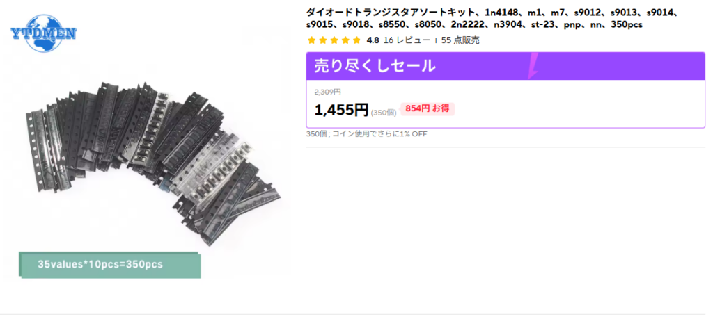 新年といえば「福袋」ですが、電子工作ファンにとっての福袋は、AliExpressの「激安アソートセット」かもしれません。 何かと国内サイトだと手に入りにくいような部品が手に入るのがアリエクですが、ほかの回路素子などを買うにあたり、サーフィンしていると「表面実装トランジスタ・ダイオード 350個アソート」というのが目に留まりました。