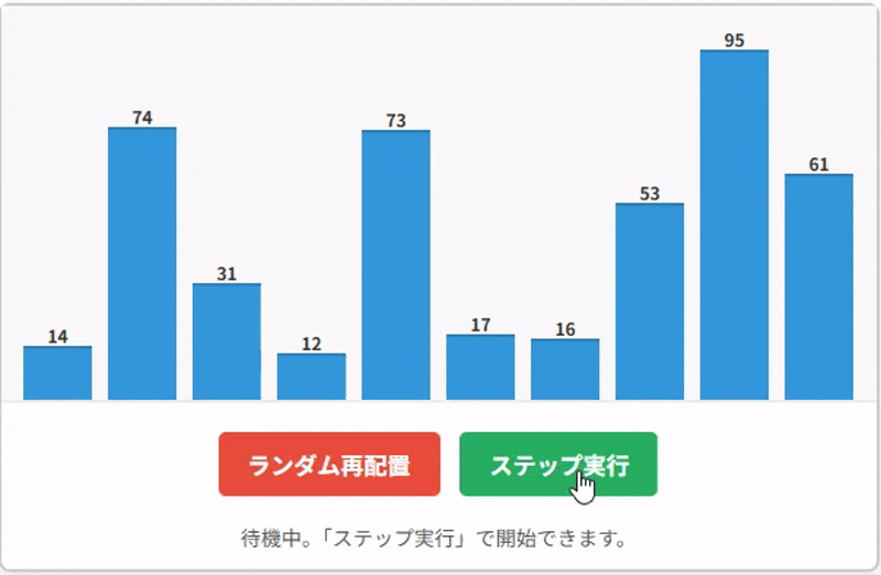 選択ソートで並び替えを試せます。ステップ実行ボタンを押して、並び替えを進めてみてください。