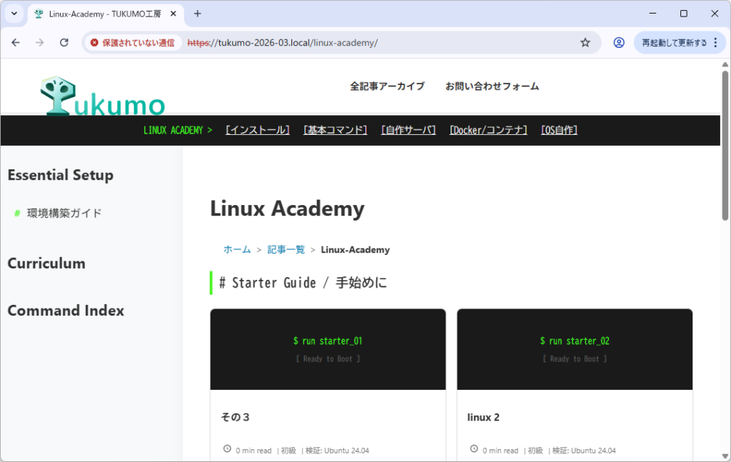 このサブホームは、単なるカテゴリ一覧ではなく、「まず環境構築から始め、次に基本操作、最終的にはサーバー構築まで」といった、ユーザーの成長に合わせた導線をフロントエンド側で新たに設計しています。