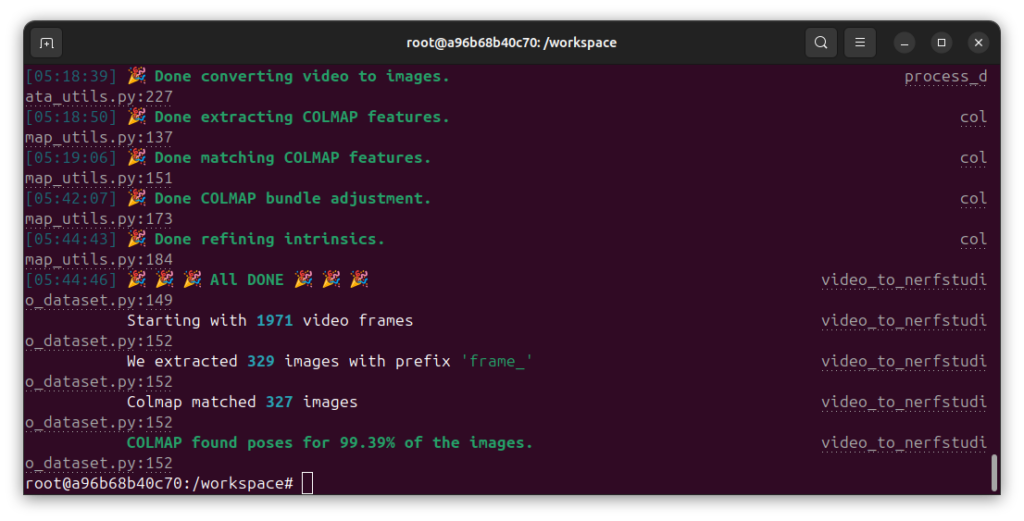 内部で行われていること: 内部では COLMAP というツールが動き、画像間の特徴点をマッチングさせて、カメラがどの位置・角度から撮っていたかを逆算しています。これを「Structure from Motion (SfM)」と呼びます。