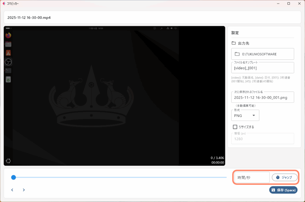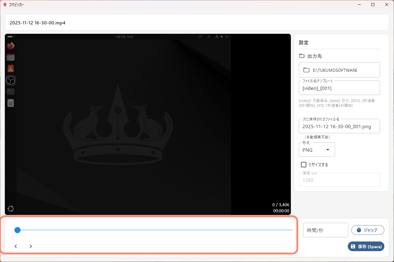 スライダーをマウス操作することで、切り出すフレームを選択できます。