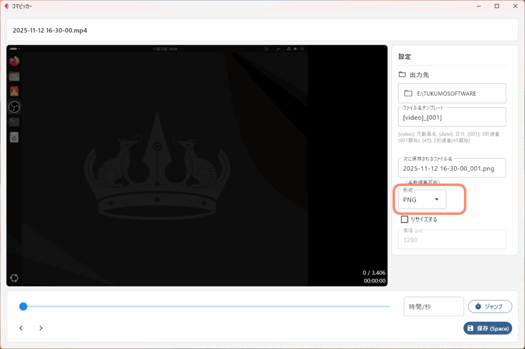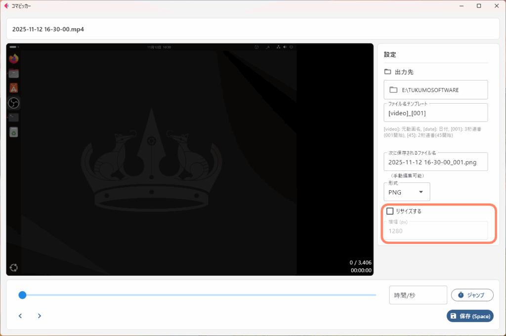 現在の動画フレームを、設定項目で設定したように命名。リサイズが有効ならリサイズして出力フォルダに画像として保存します。
