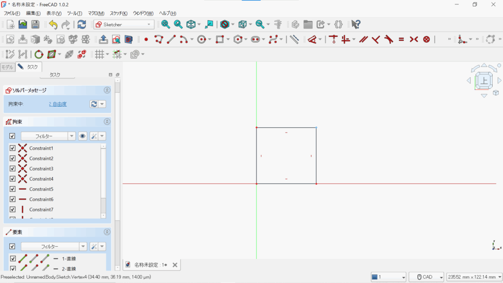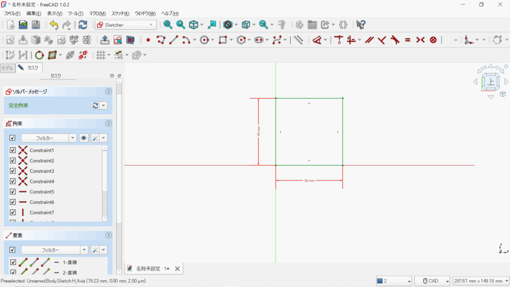 スケッチの辺の長さを拘束します。ここで拘束することで長さを決めることができます。