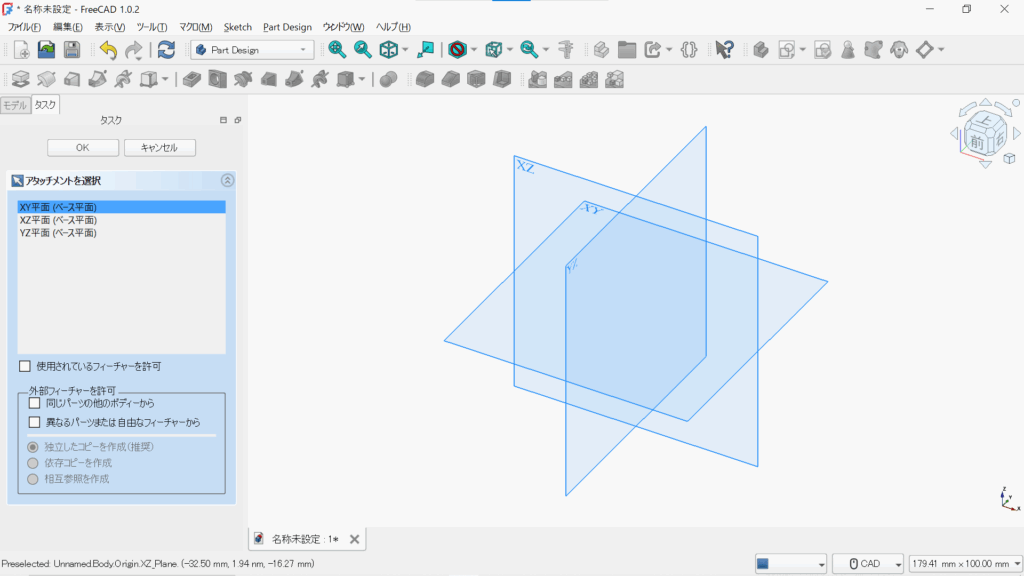 XY平面を選択し ”OK”でスケッチの記述に進みます。