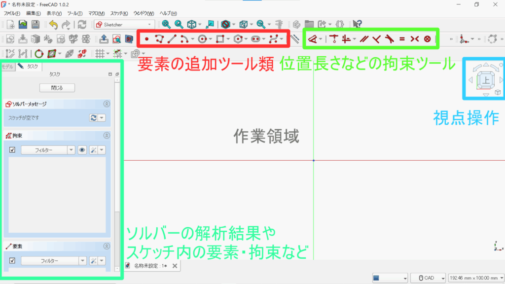 面を指定してスケッチを作成すると、以下の画像のようなスケッチ作業画面になります。スケッチ作業画面で主に使う項目は以下のものです。