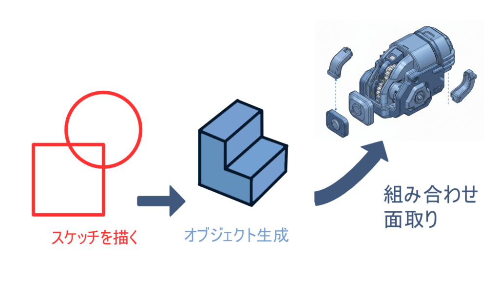 また、初めてのモデリングなので、基本的な機能のスケッチからオブジェクト(今回)にすること、作ったオブジェクトのブール演算(次の記事)、面取りや丸めなどの最終工程の3段階に分けて紹介していきます。