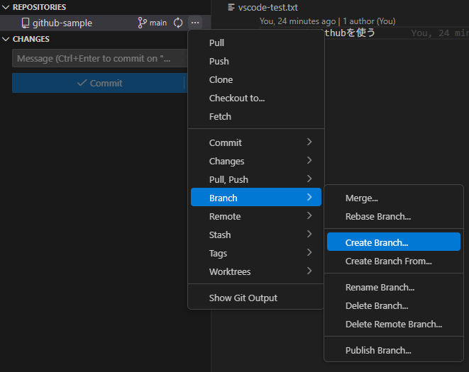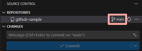 また、ブランチを切り替えたいときは、左側の”SOURCE CONTROL”のブランチのアイコンをクリックしたら出てくるメニューで切り替え可能です。