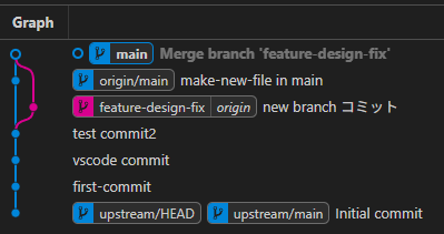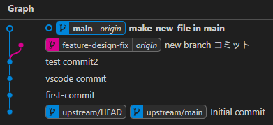 グラフを見てみると、分岐しているのがわかりますね。この状態だと、feture-design-fixのブランチでのファイル操作は、mainに適用されず、その逆もしかりです。