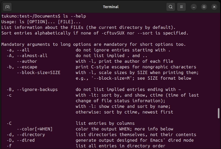 オプションは、コマンドの後ろに (ハイフン) を付けて指定します。”コマンド -t -l -r ” または、”コマンド -tlr “のように記述することでコマンドの出力を調整できます。