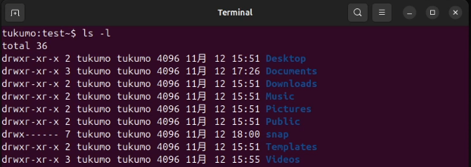 現在地がわかったら、次にその場所(/home/username)に「何があるか」を見てみましょう。 ls と入力して Enter キーを押します。