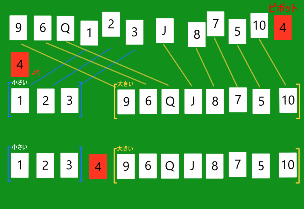 [9, 6, Q, 1, 2, 3, J, 10, 8, 7, 5,4](ピボット) - パーティション(分割)操作:ピボット以外の要素(左端から)を順に見ていき、「ピボット”4″以下のグループ」と「ピボット”4″より大きいグループ」に振り分けます。(※実際の実装はもう少し複雑ですが、ここでは概念的な動きを示します)